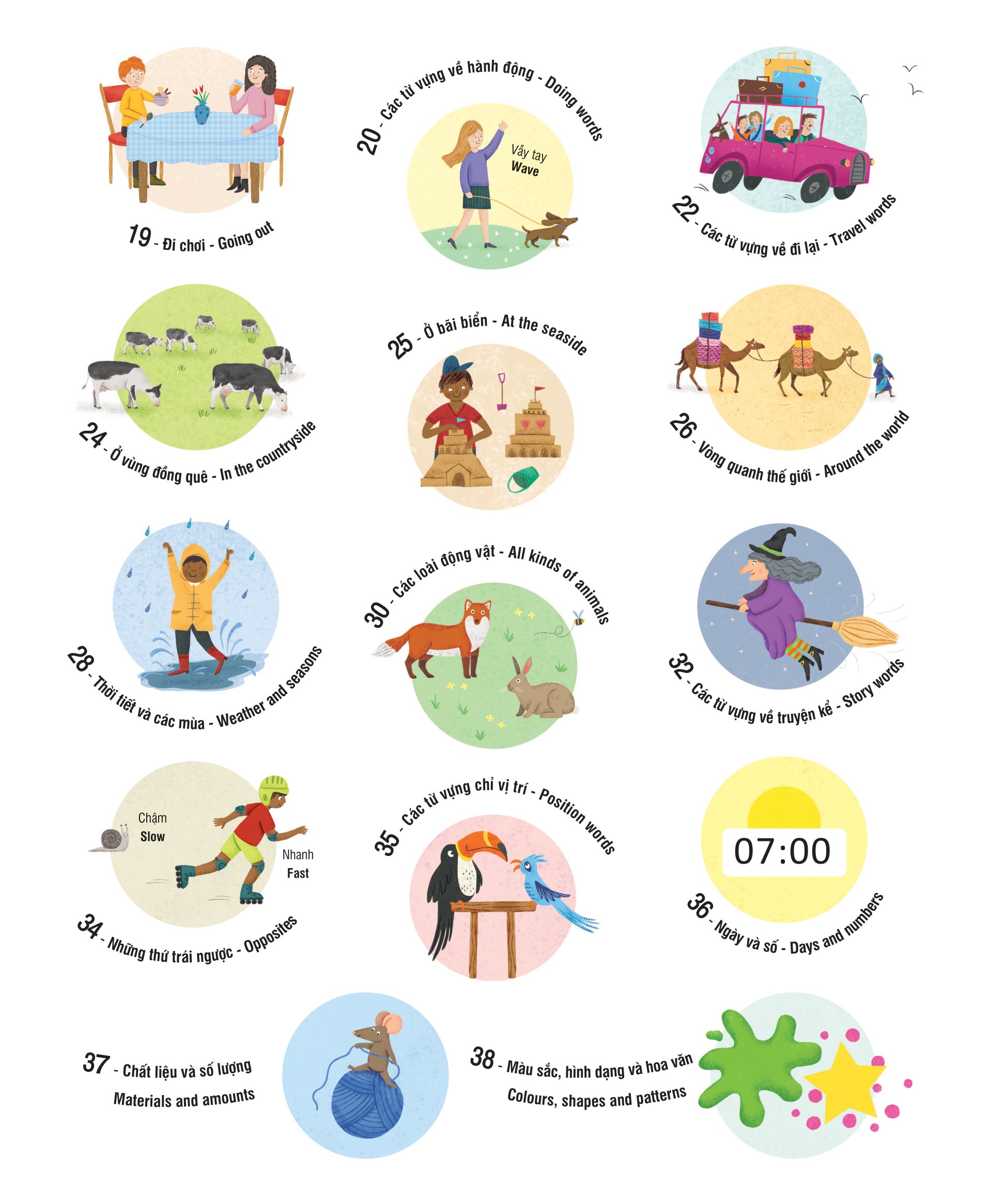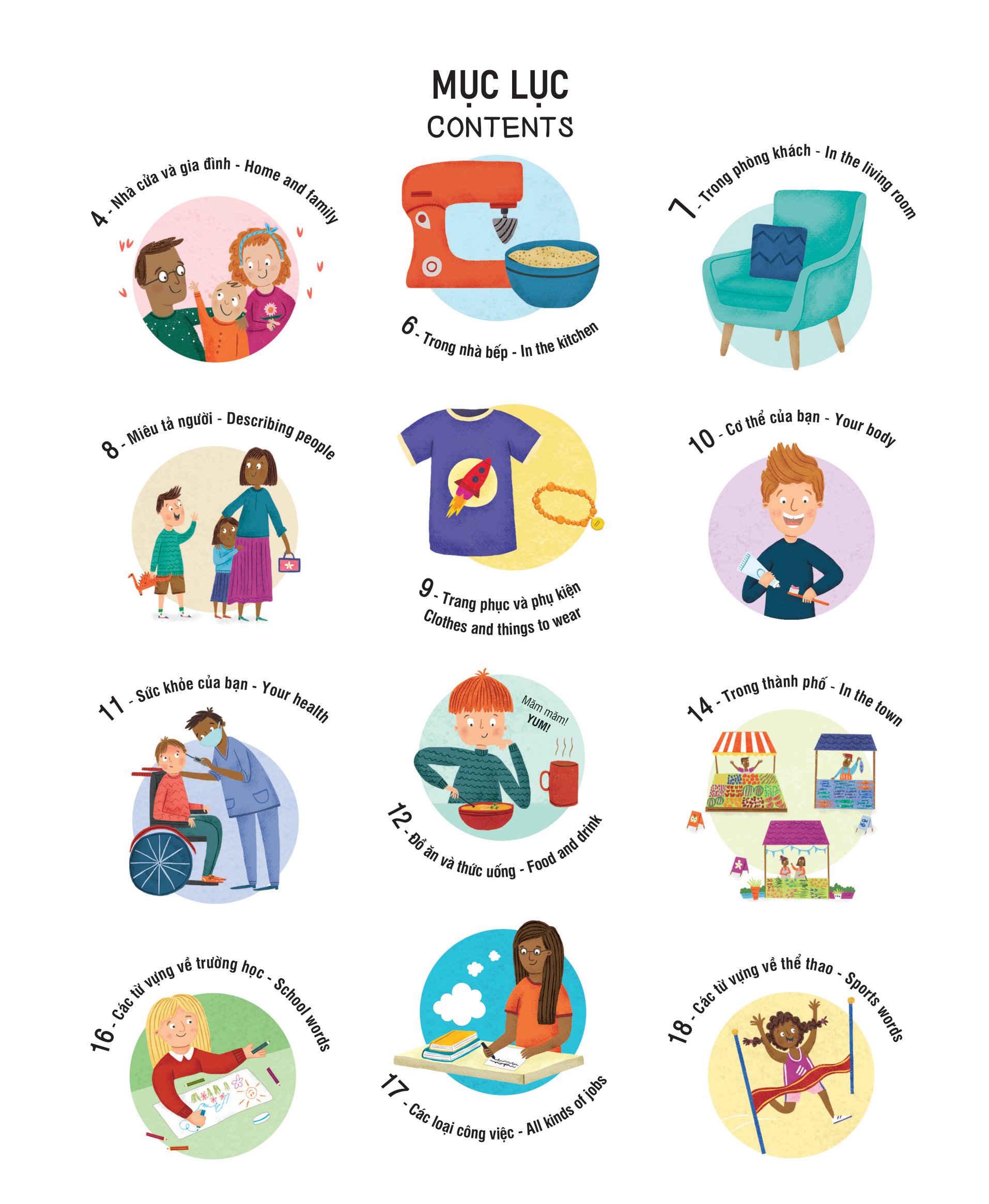 Cuốn sách bao gồm các từ vựng quan trọng trong các lĩnh vực như gia đình, trường học, nghề nghiệp, thế giới xung quanh, động vật, thực vật, và các đồ vật trong cuộc sống hàng ngày. Các từ vựng được chia theo từng chủ đề, trong ngữ cảnh khác nhau để giúp trẻ hiểu rõ hơn về cách sử dụng các từ. Cuốn sách thú vị này này không chỉ giúp bé dễ dàng nhận biết mặt chữ, phát âm chuẩn, biết được nhiều từ vựng mà còn thêm hứng thú với việc học tiếng Anh.