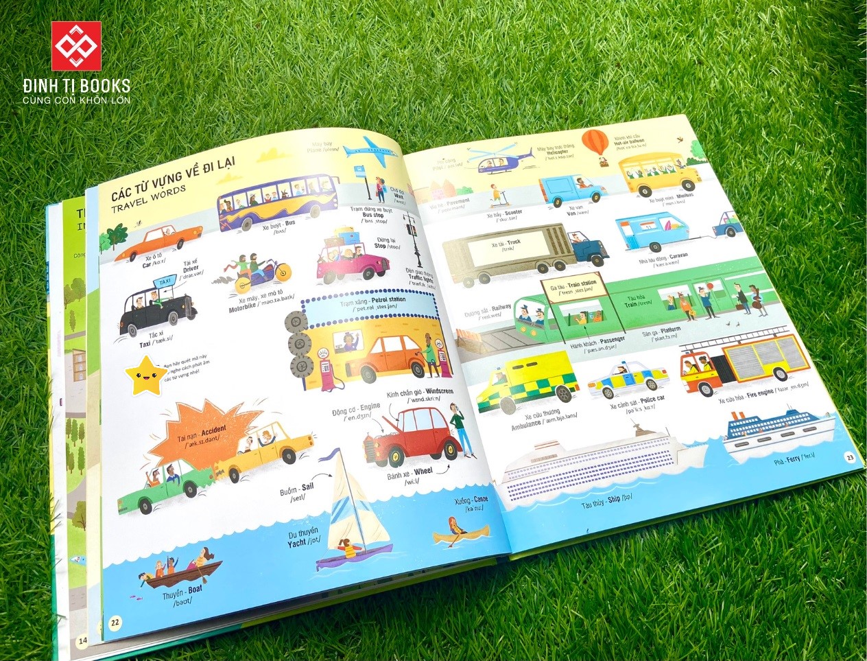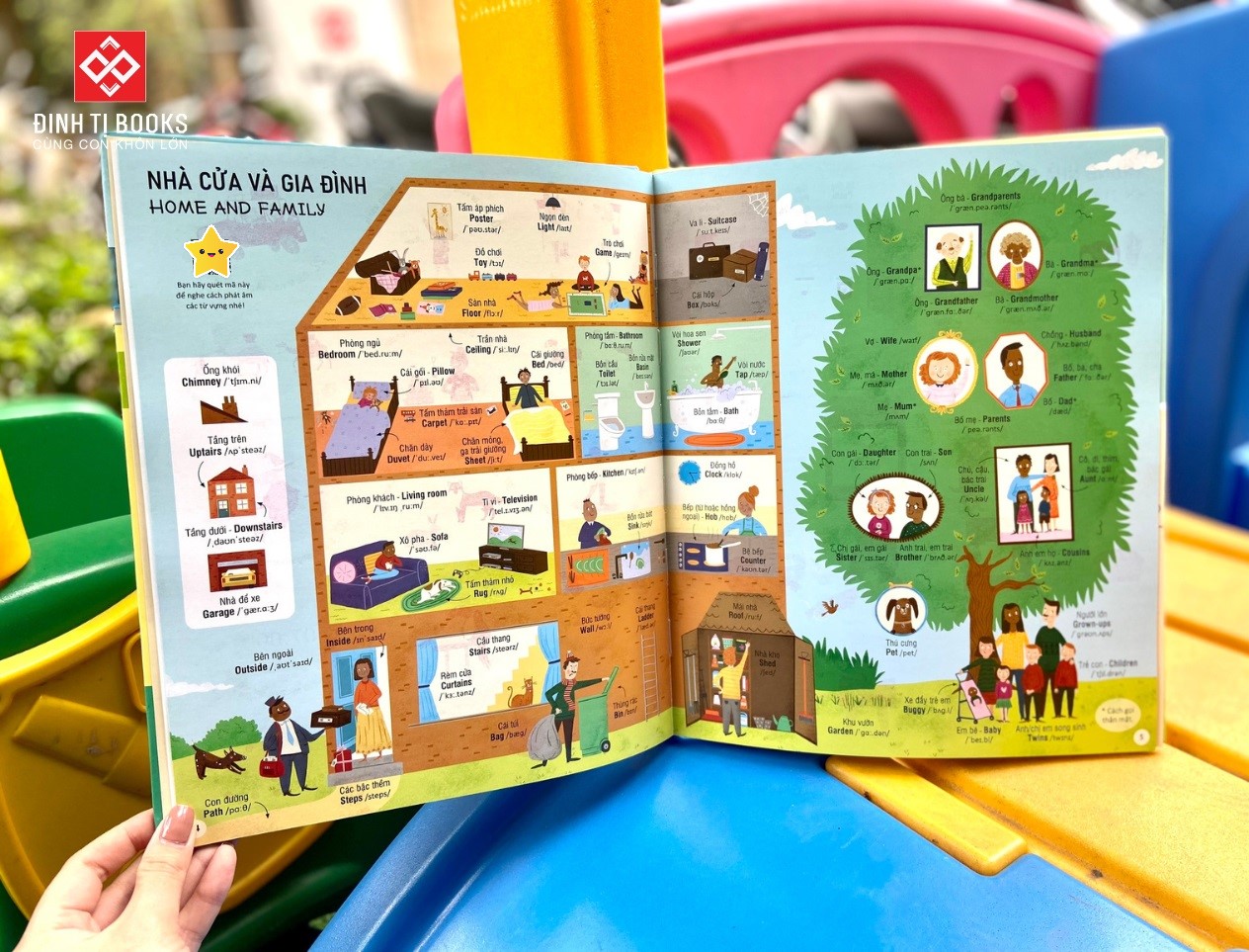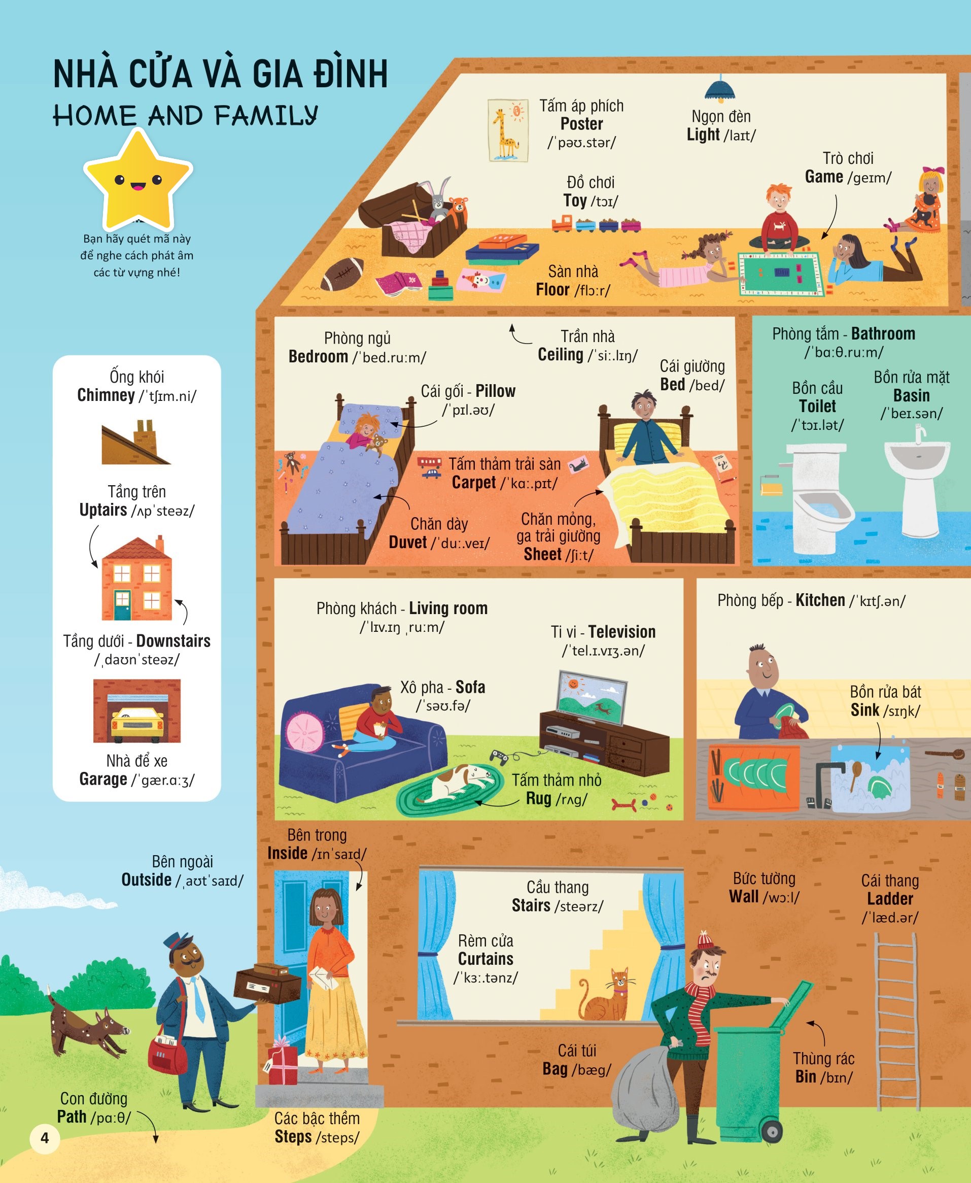 Cuốn sách in khổ sách lớn, bìa cứng để trẻ dễ dàng quan sát với từng chi tiết hình ảnh. Các hình ảnh được minh họa và màu sắc sinh động để giúp trẻ em dễ dàng hình dung và ghi nhớ từ vựng. Mỗi từ đều có phiên âm và mã QR nghe cách phát âm từng từ vựng theo giọng đọc của người bản xứ để trẻ đọc theo một cách dễ dàng và chính xác nhất.
